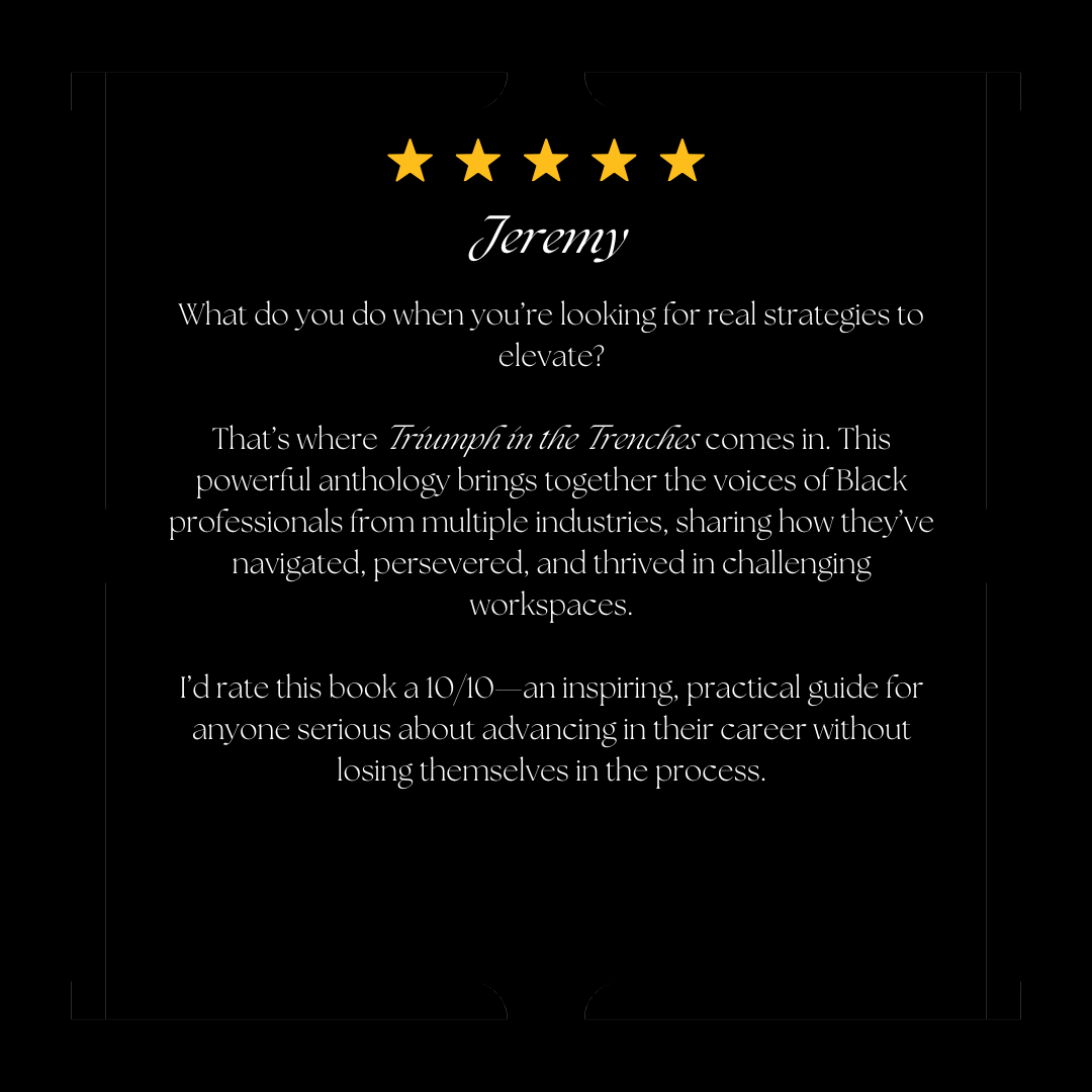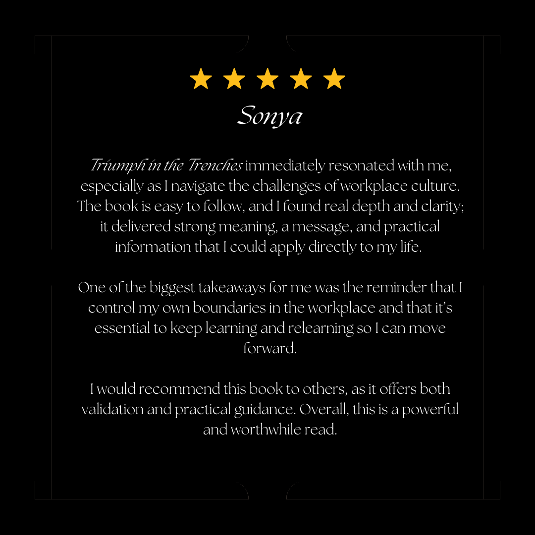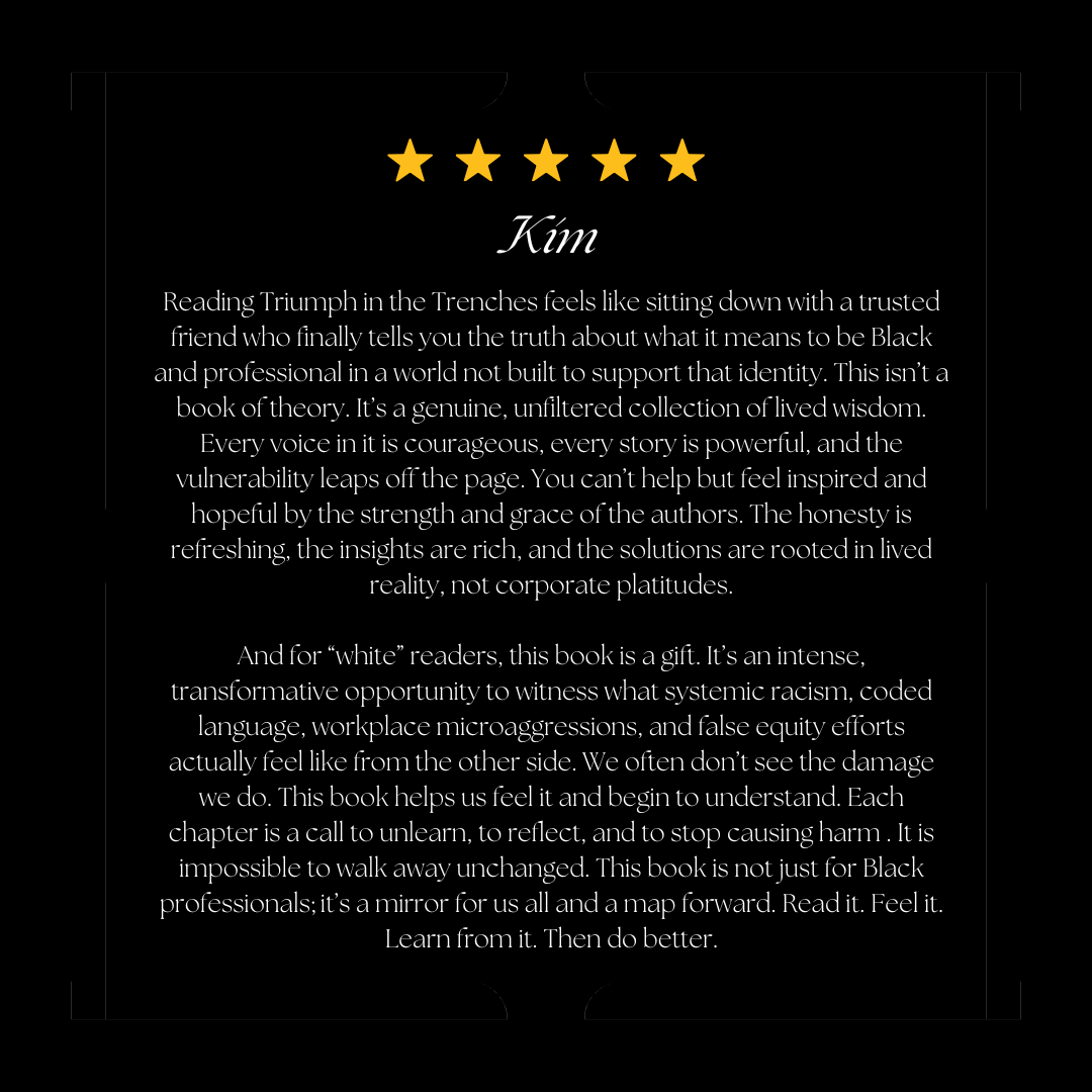 A modern guide for professionals, Triumph in the Trenches empowers readers to transcend systemic inequities while paving the way for future generations. Celebrating courage, collaboration, and the indomitable human spirit, this book reminds us that the path to empowerment and equity starts with intentional action.